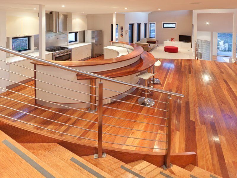 The builders own home is a brilliant design that makes the most of this hillside spot featuring an elevated lounge flanked in glass, doors to the observation balcony and a mezzanine-style dining area that enjoys the same vista.